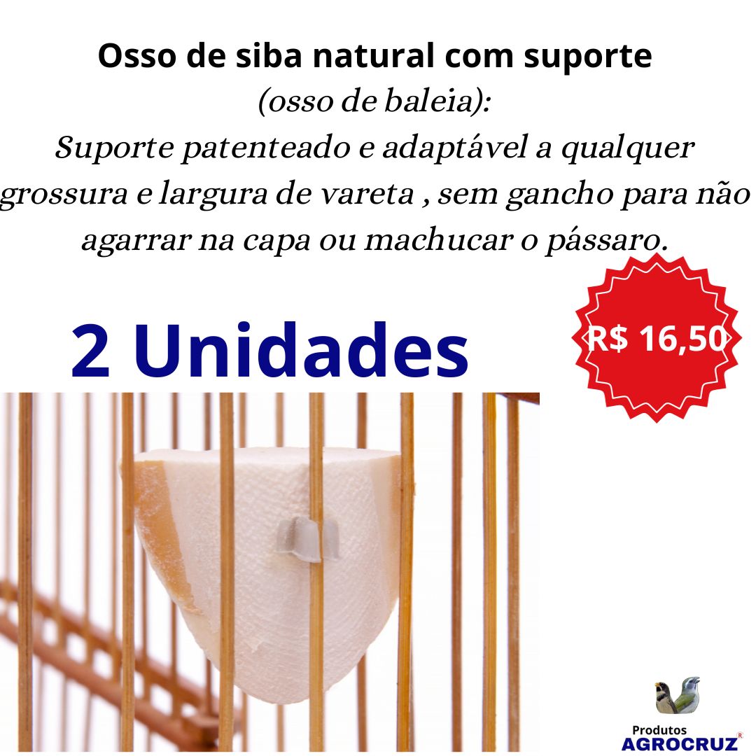 Para prender o osso de Siba na gaiola a AGROCRUZ®  desenvolveu um suporte plástico patenteado que encaixa em qualquer grossura e largura de vareta, sem gancho para não agarrar na capa ou machucar o pássaro.